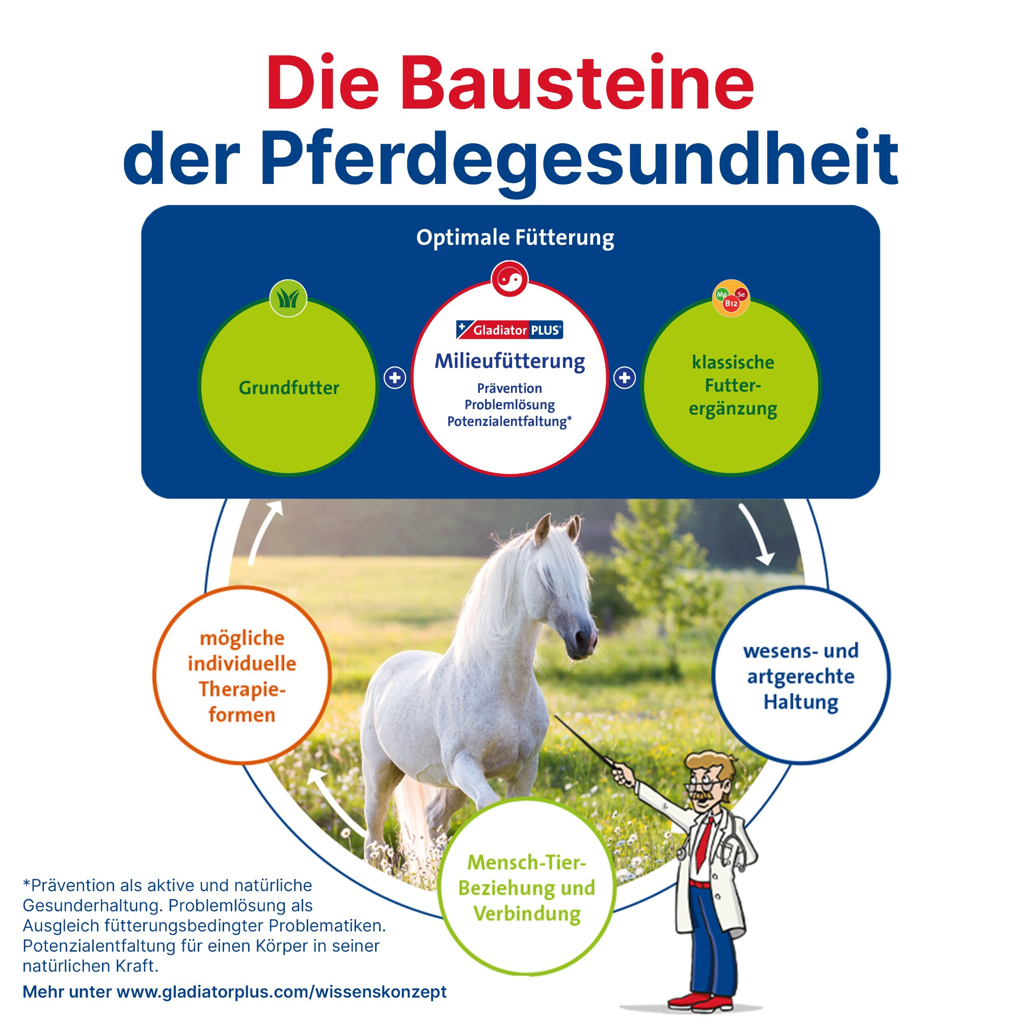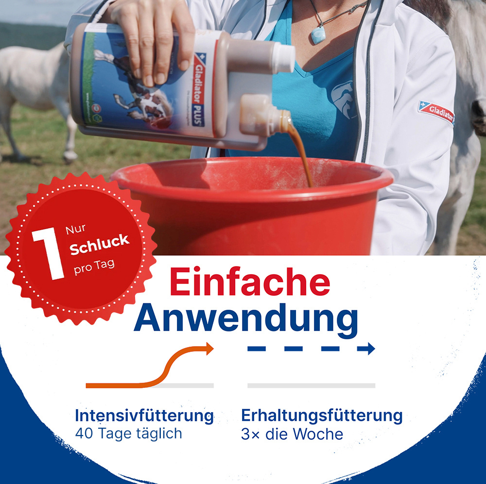 GladiatorPLUS wird über das Futter gegeben und sollte deinem Pferd individuell nach Bedarf angepasst werden. Es ersetzt kein Kraft- oder Mineralfutter.