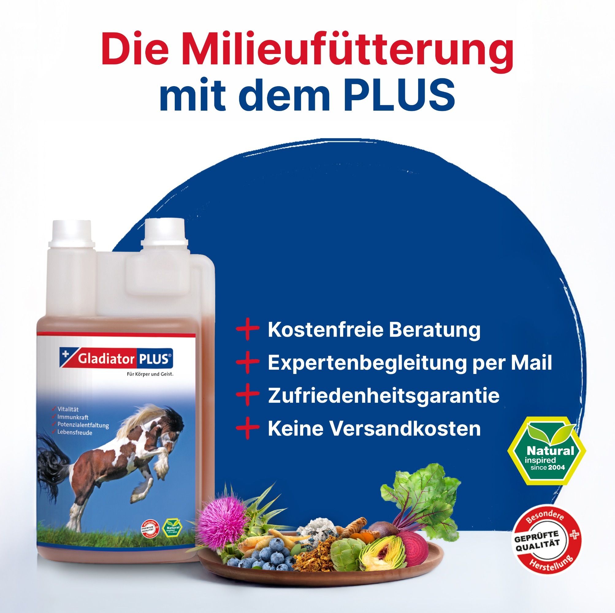 Die GladiatorPLUS Milieufütterung ist eine All-in-one-Essenz, die dein Pferd durch ihre Premium-Naturstoffe unterstützt und so dazu beiträgt, die normale Vitalität, Immunkraft und Lebensfreude zu erhalten. Sie fördern in Verbindung mit einer artgerechten Haltung, bedarfsgerechten Fütterung und guten Mensch-Tier-Beziehung die natürliche Gesundheit und tragen so dazu bei, das Krankheitsrisiko zu senken.