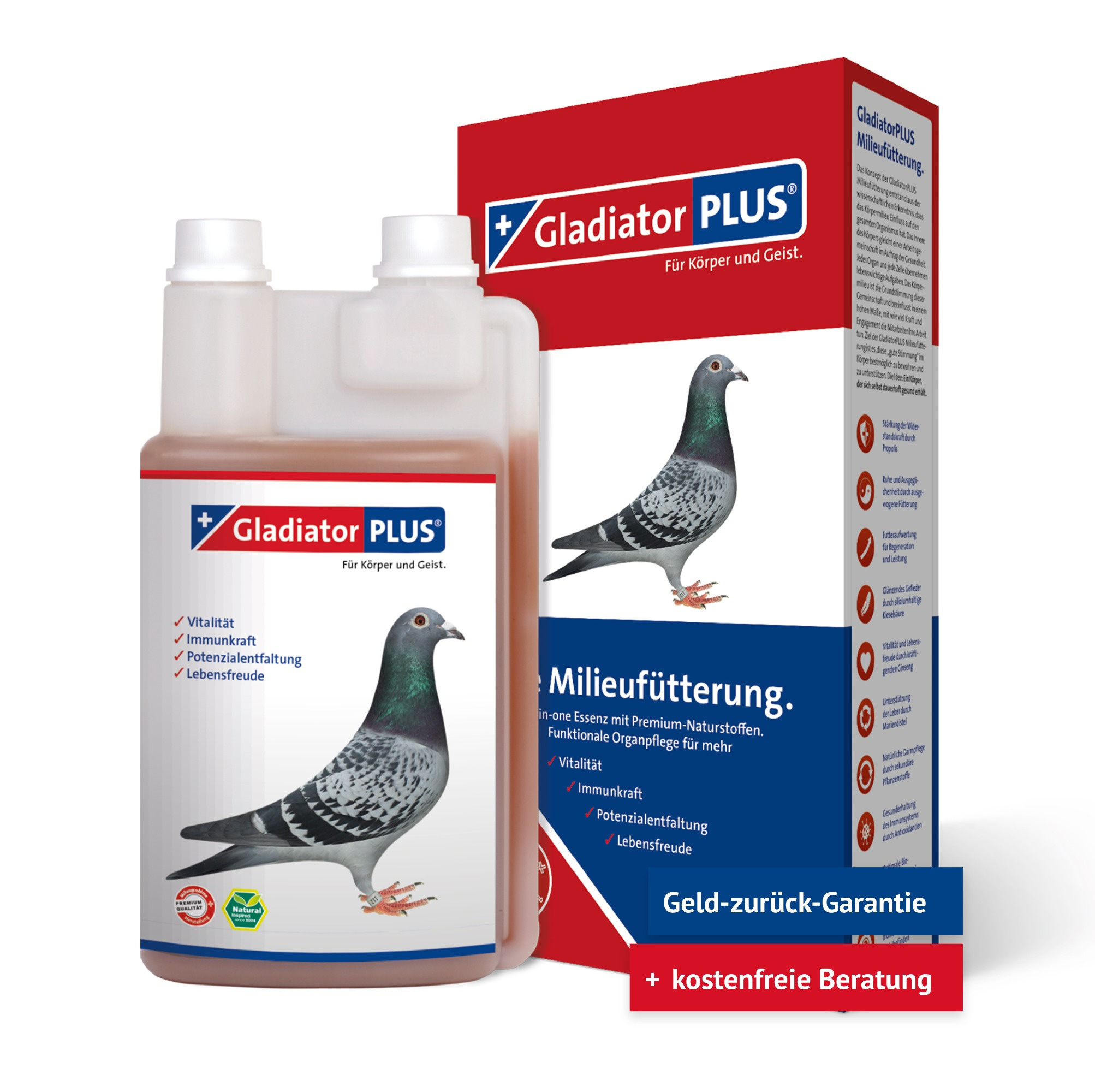 Die GladiatorPLUS Milieufütterung ist eine All-in-one-Essenz, die deine Taube durch ihre Premium-Naturstoffe unterstützt und so dazu beiträgt, die normale Vitalität, Immunkraft und Lebensfreude zu erhalten. Sie fördern in Verbindung mit einer artgerechten Haltung, bedarfsgerechten Fütterung und guten Mensch-Tier-Beziehung die natürliche Gesundheit und tragen so dazu bei, das Krankheitsrisiko zu senken.