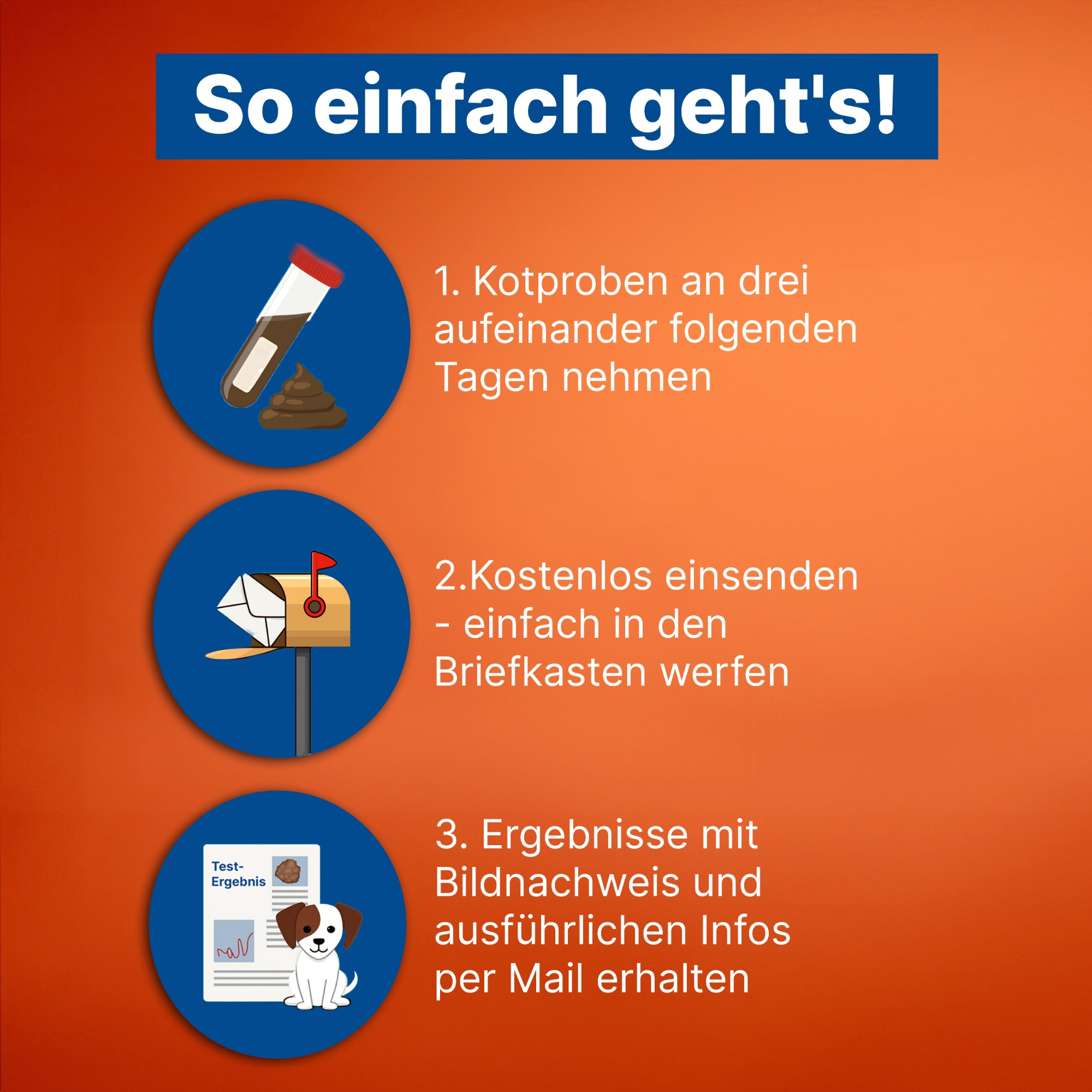 Das Sammeln von Kotproben an drei aufeinanderfolgenden Tagen erhöht die Genauigkeit der Kotanalyse erheblich. Parasiten wie Würmer, Giardien oder Kokzidien werden oft nicht täglich ausgeschieden, sodass eine einmalige Probe möglicherweise keine Wurmeier oder Larven enthält. Durch das Sammeln über mehrere Tage steigt die Wahrscheinlichkeit, alle Parasitenstadien zu erfassen, falls ein Befall vorliegt. So erhältst du ein zuverlässigeres Testergebnis und vermeidest ein potenzielles "falsch-negatives" Ergebnis.