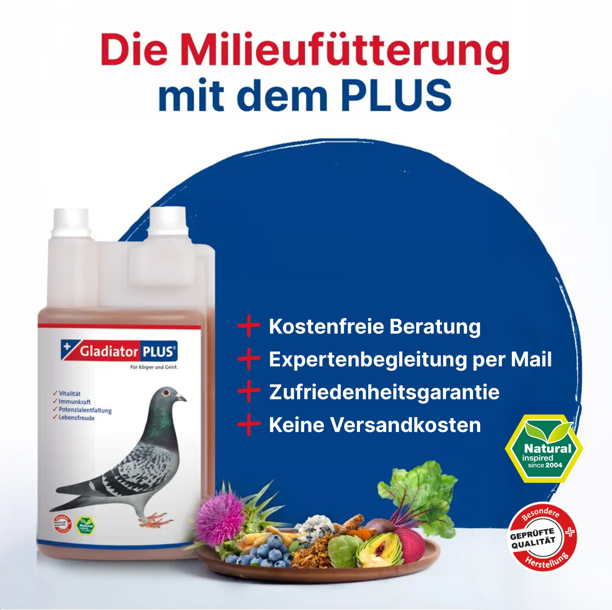 Die Natur ist eine geniale Problemlöserin. Sie hat ein klares Ziel – Leben fördern und erhalten. Diese Kraft steckt in der GladiatorPLUS Milieufütterung. Mit Propolis, Ginseng, Kurkuma, Mariendistel, Kieselsäure, Rote Bete, Heidelbeere und Artischocke enthält die GladiatorPLUS Milieufütterung Premium-Naturstoffe in höchster Qualität, vielfach bewährt in der Praxis. Ein weiterer entscheidender Faktor ist die Kombination der besonderen Inhaltsstoffe. Diese ist bis ins Detail durchdacht und präzise dosiert. Die GladiatorPLUS Milieufütterung enthält nur, was auch wirklich Sinn macht. Das ist bestes Naturwissen in einem Produkt.